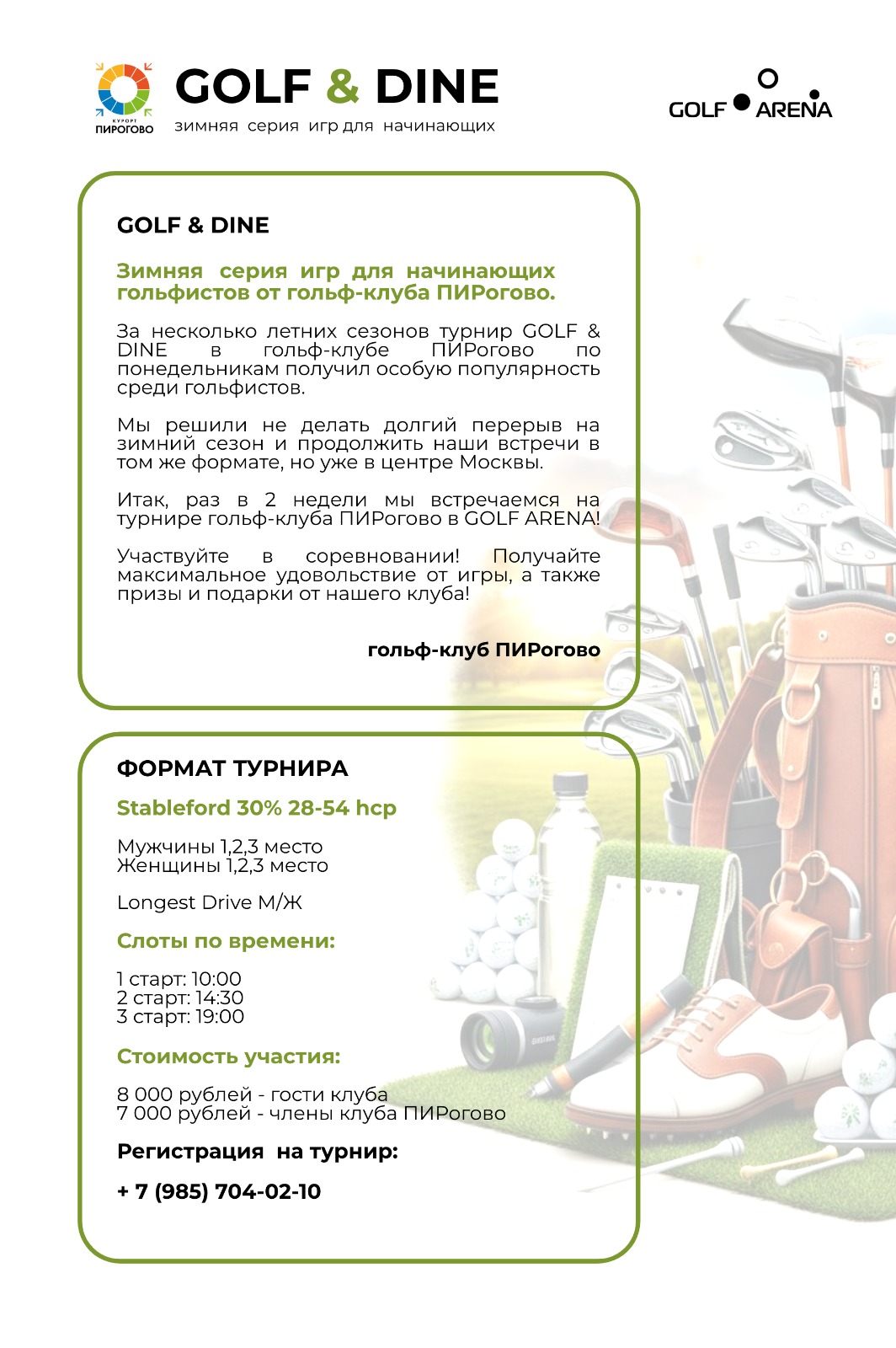 За несколько летних сезонов турнир GOLF & DINE в гольф-клубе ПИРогово по понедельникам получил особую популярность среди гольфистов. Мы решили не делать долгий перерыв на зимний сезон и продолжить наши встречи в том же формате, но уже в центре Москвы. Итак, раз в 2 недели мы встречаемся на турнире гольф-клуба ПИРогово в GOLF ARENA!
