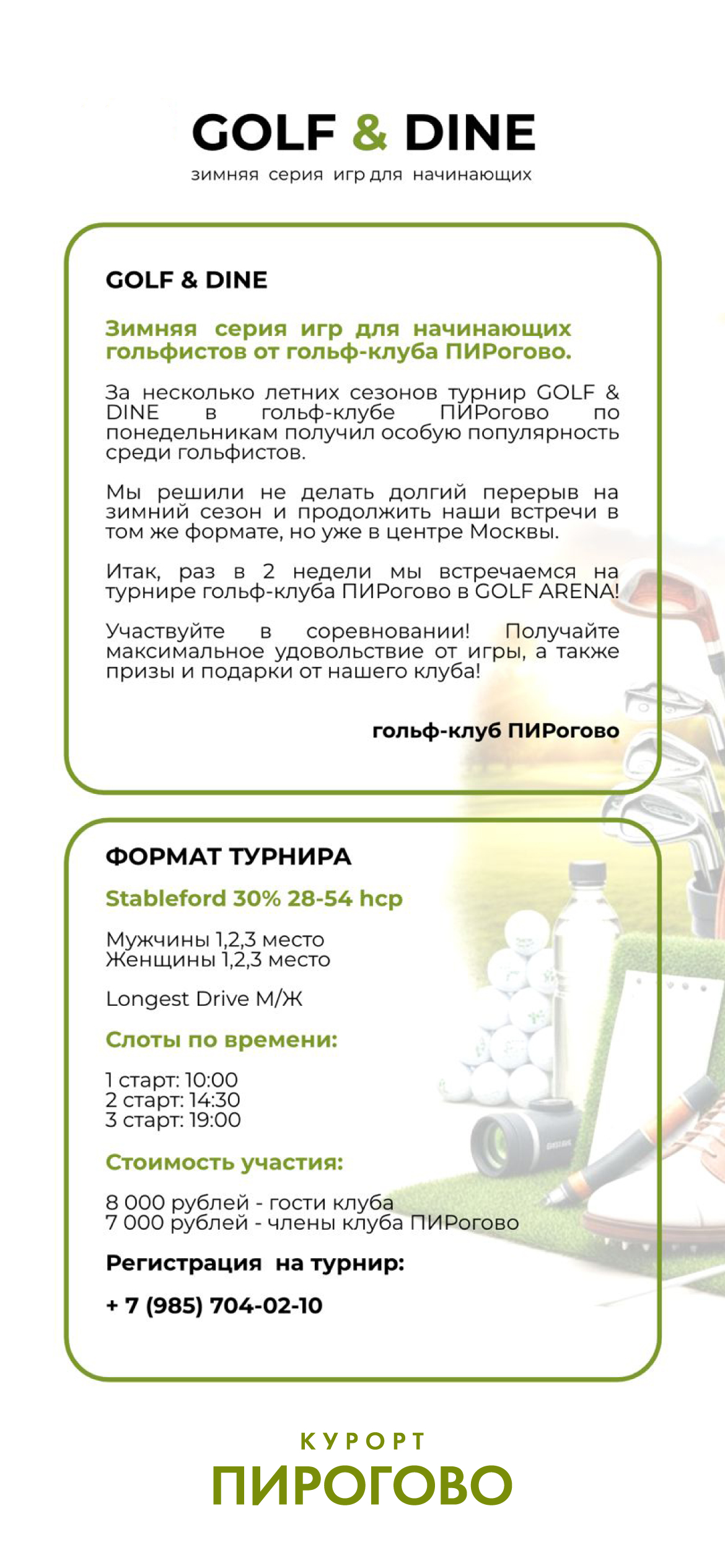 За несколько летних сезонов турнир GOLF & DINE в гольф-клубе ПИРогово по понедельникам получил особую популярность среди гольфистов. Мы решили не делать долгий перерыв на зимний сезон и продолжить наши встречи в том же формате, но уже в центре Москвы. Итак, раз в 2 недели мы встречаемся на турнире гольф-клуба ПИРогово в GOLF ARENA!