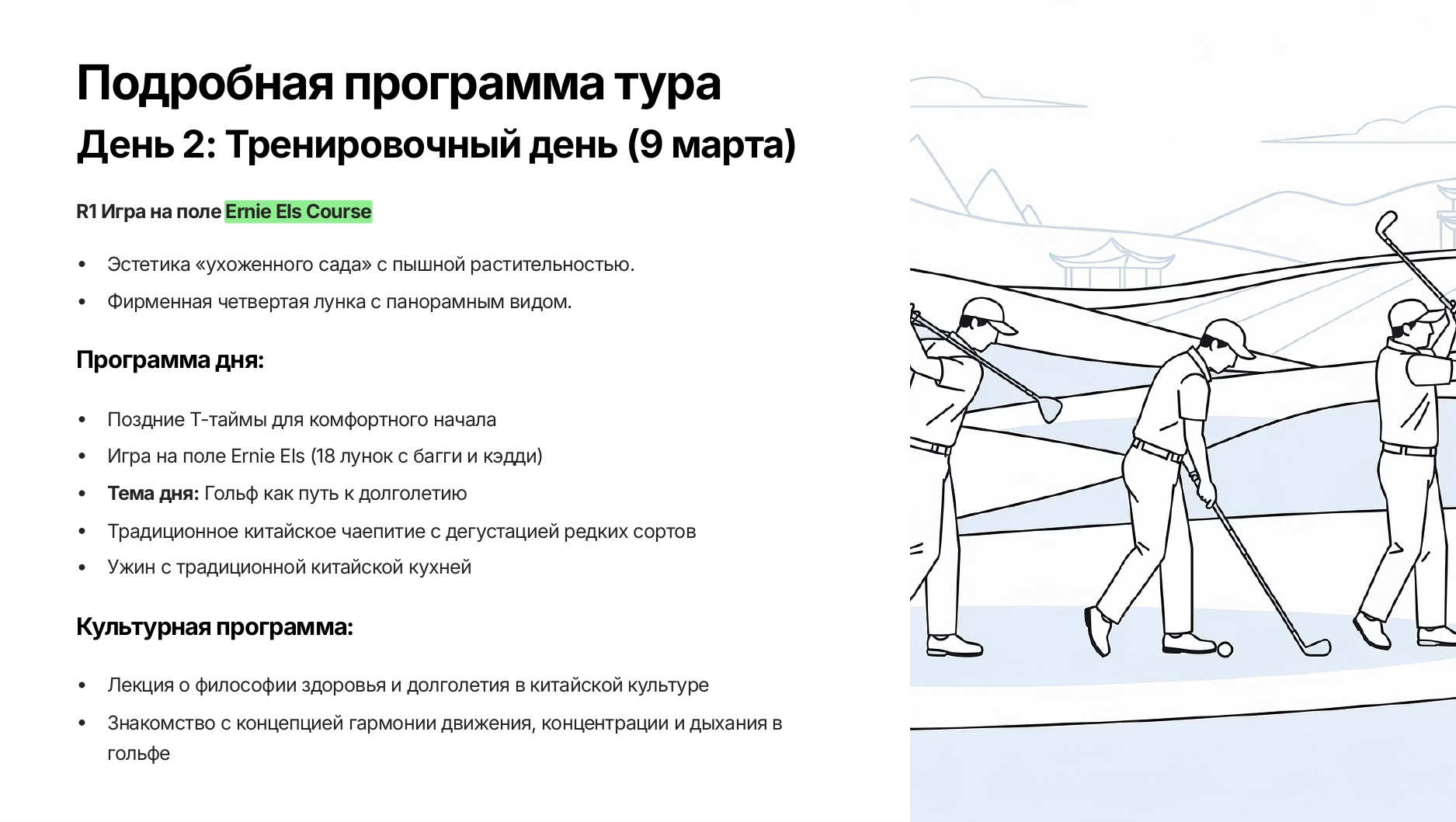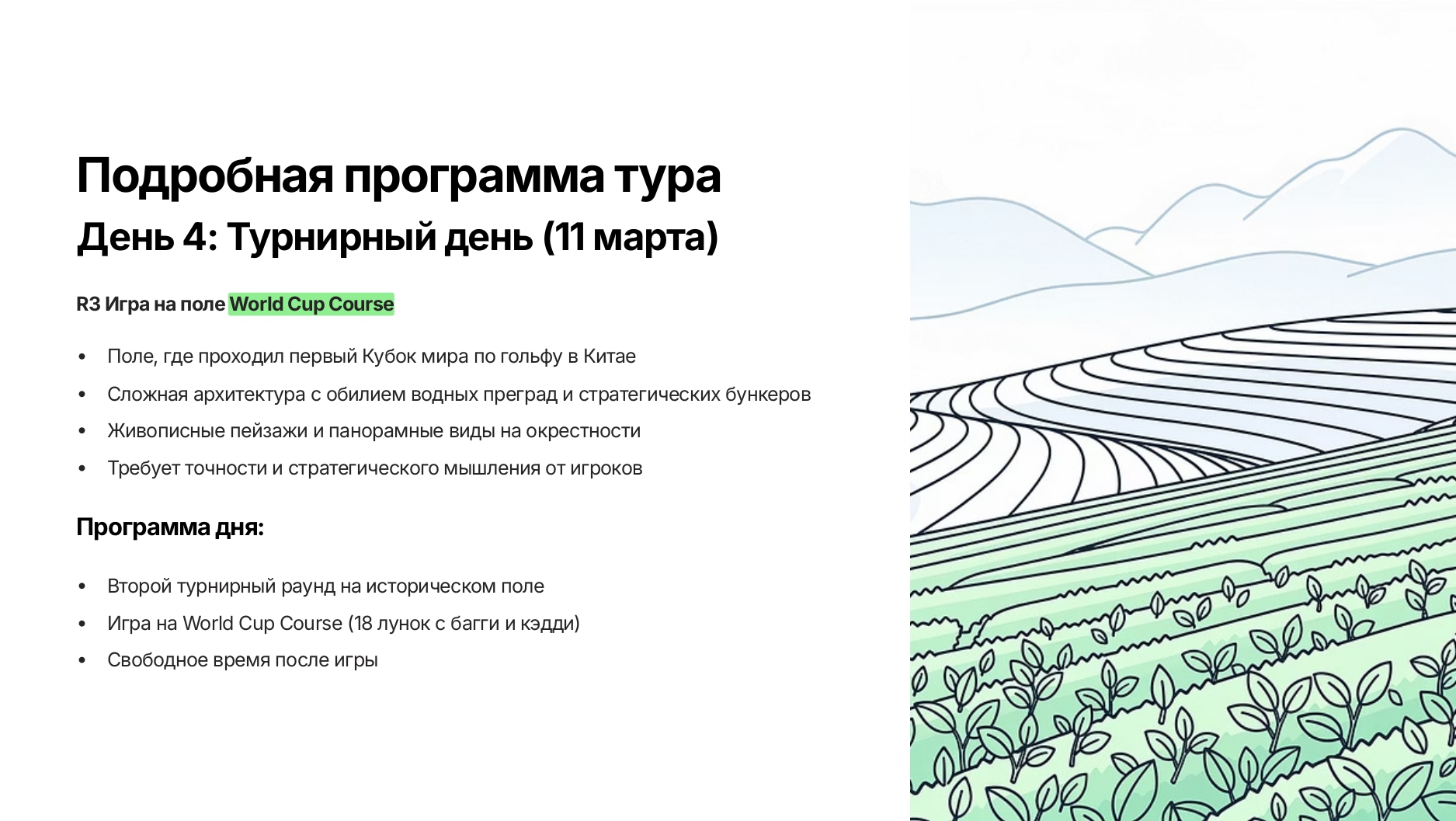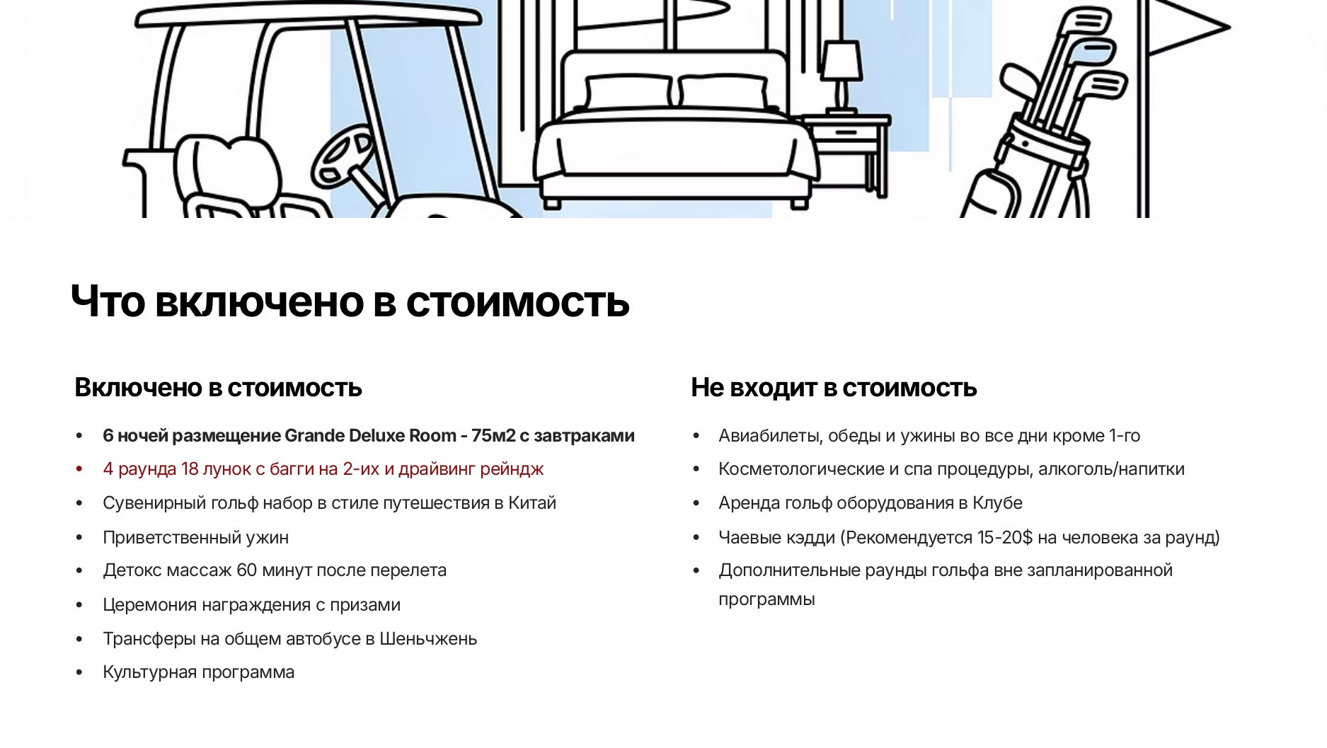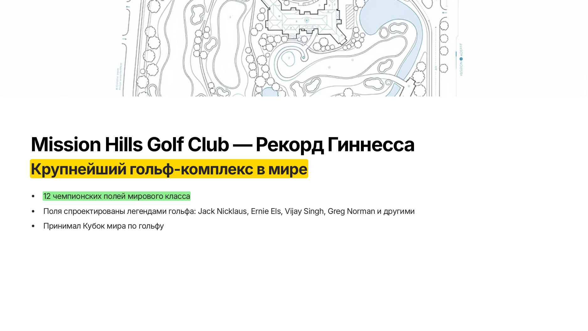 Mission Hills — один из самых известных гольф-курортов мира и настоящий город гольфа, отдыха и впечатлений. Комплекс внесён в Книгу рекордов Гиннеса и славится масштабом: множество чемпионских полей, премиальная инфраструктура и сервис уровня luxury. Здесь гольф сочетается с идеальным восстановлением: спа, термальные зоны, велнес и атмосфера полного перезаряда.