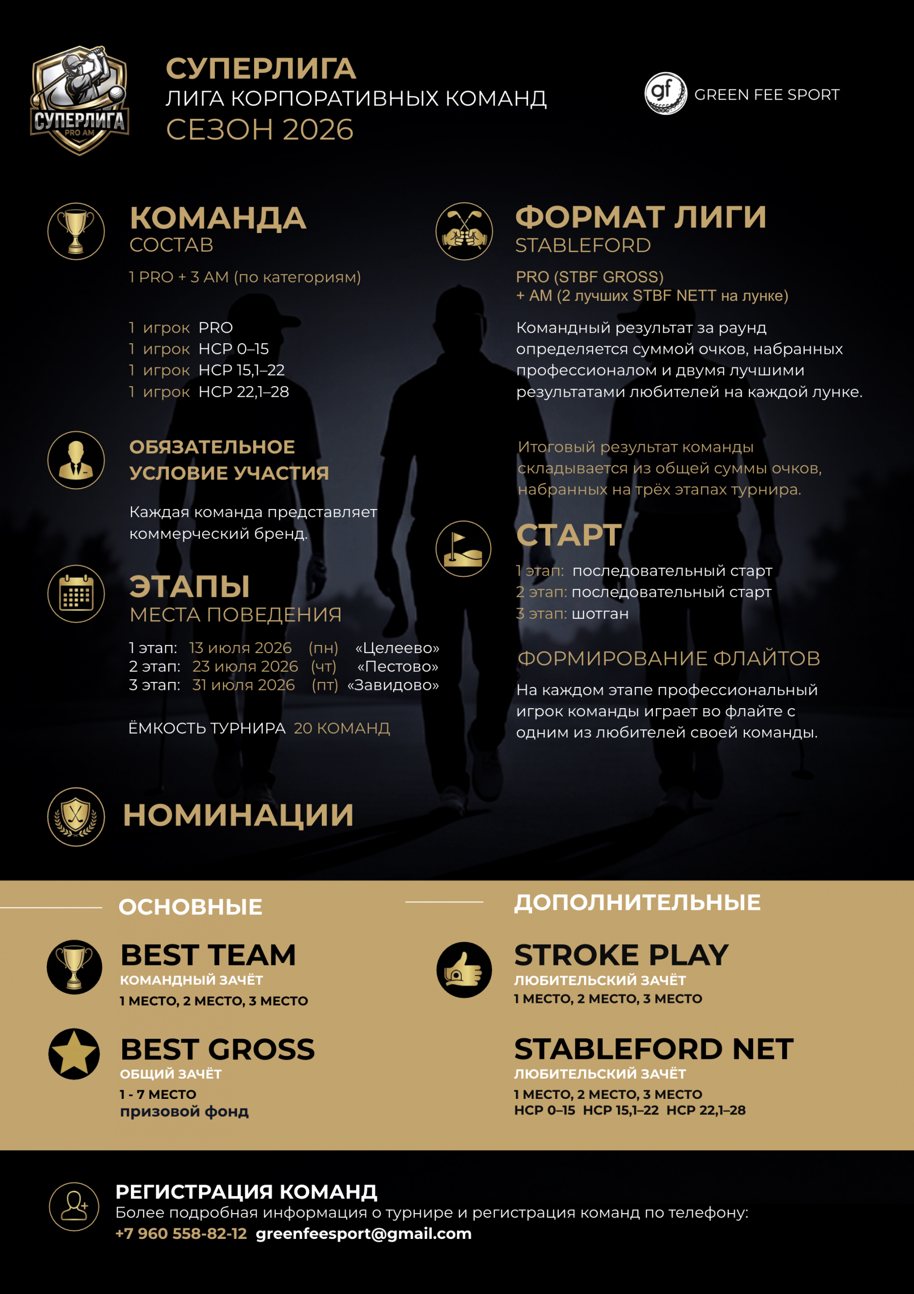 СУПЕРЛИГА — это гольф-турнир, объединяющий любителей и профессионалов под флагами корпоративных брендов. Команды собираются не просто играть, а побеждать!